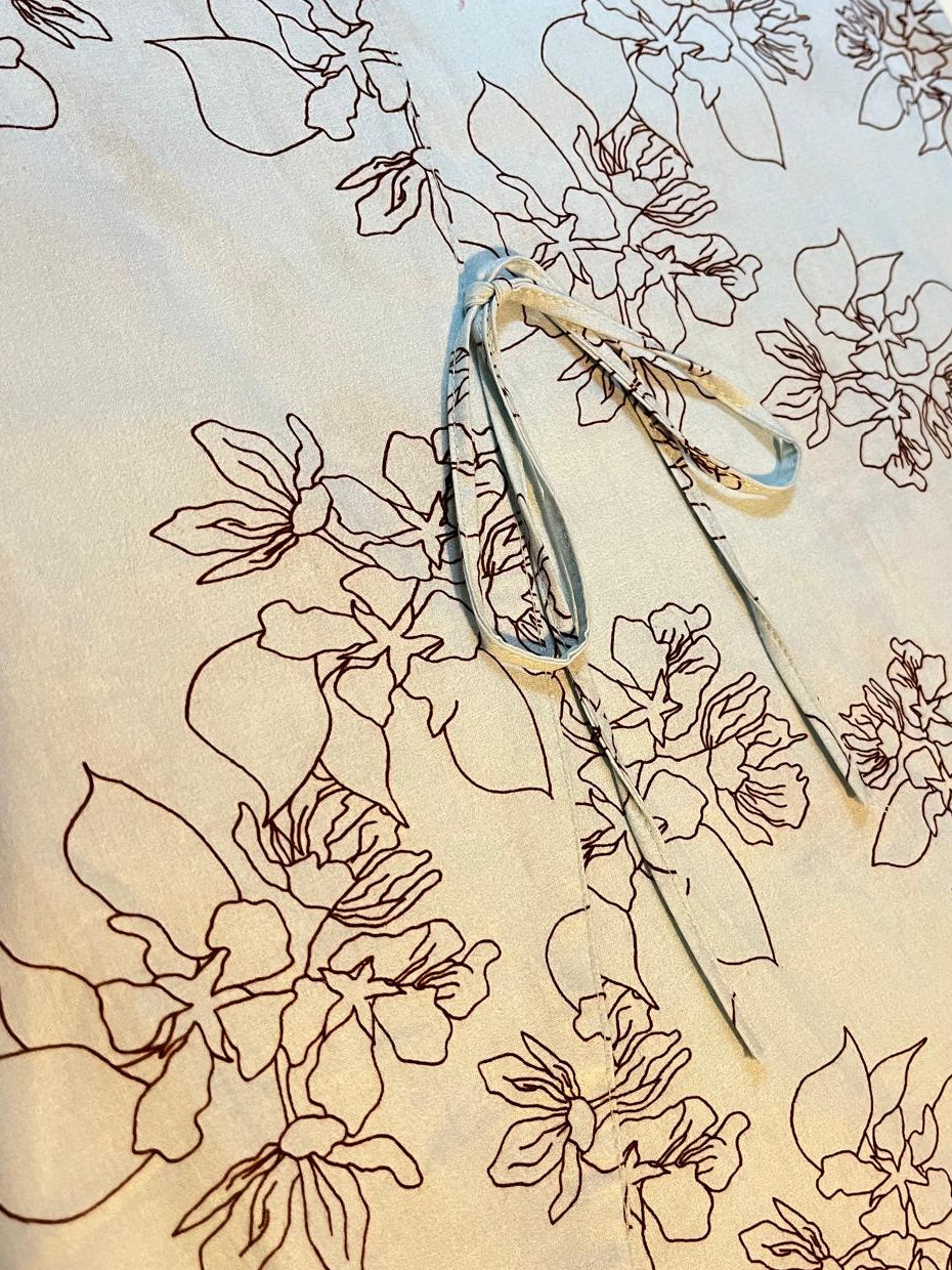 Smuk top med høj hals og fin sløjfe detalje ved taljen. Toppen er lyseblå med smukke mørkebrune blomster. Fuldend looket med matchende bukser "Elina Pants"