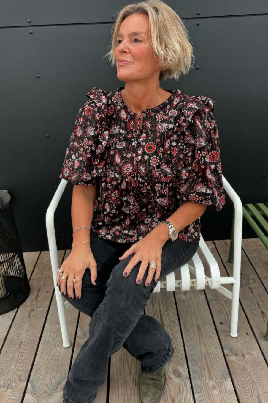 Sød bluse med smukke detaljer og en lækker rumlig pasform. Findes også i mørkeblå.