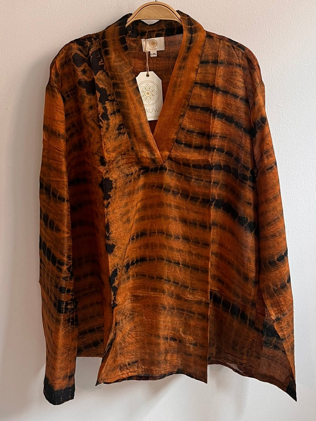 Fantastisk skjorte i silke med v-udskæring. Silke skjorterne er unika med alverdens fine detaljer.