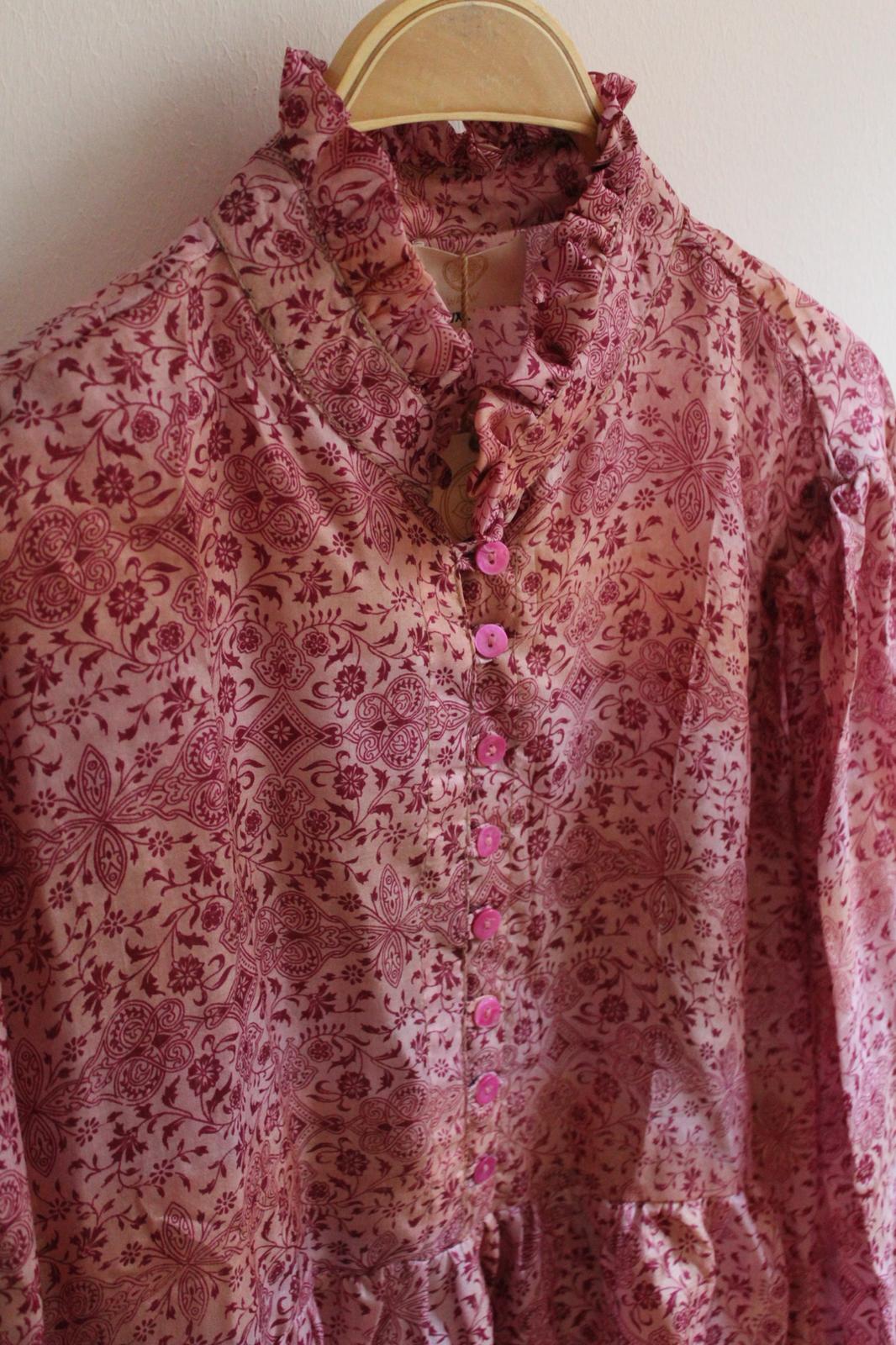 Smukkeste skjorte i silke med knappelukning ved brystet og elastik ved ærmerne. Alle skjorterne er unika og fyldt med mange smukke detaljer.